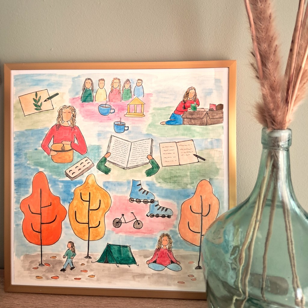 Wat ik (nog) (meer) wil doen als ik een zee van tijd heb: wandelen in de natuur, kamperen, mediteren, koken en bakken, lezen, schrijven, inlineskaten, fietsen, tekenen en schilderen (deed ik dus al), koffiebars, musea, meer tijd met familie en vrienden doorbrengen (beetje gaan buurten – niks leuker dan dat) en wat oprommelen (doe ik graag want dit geeft me rust).
